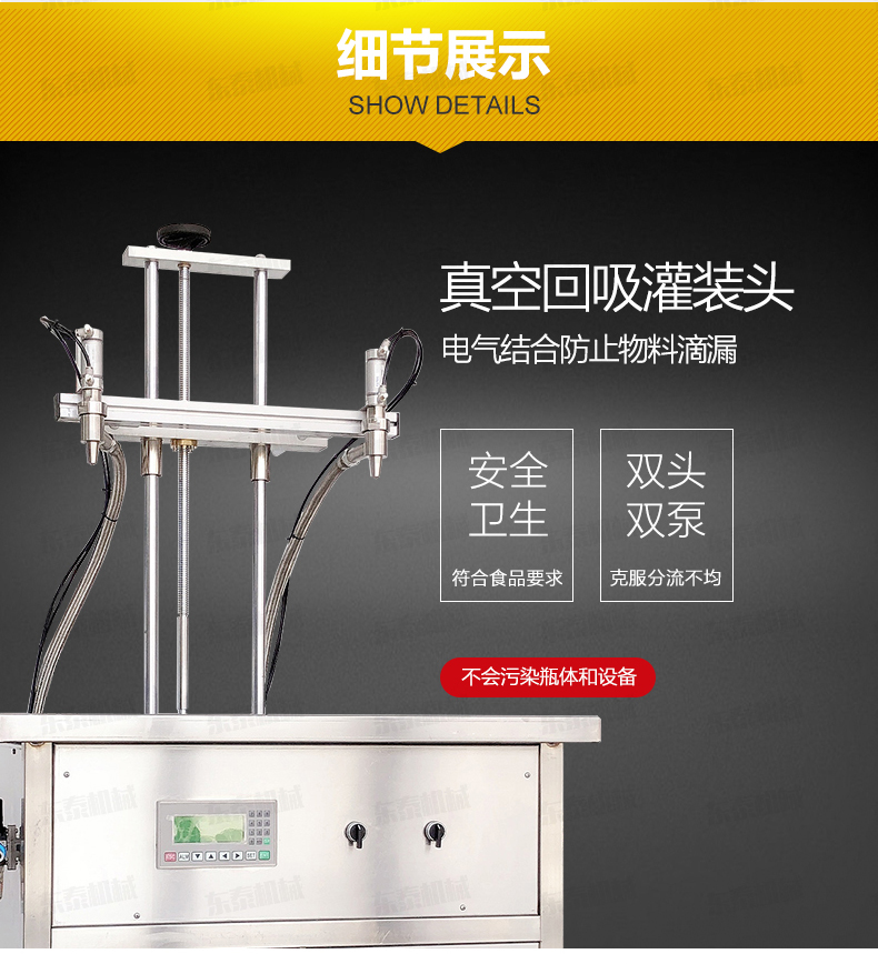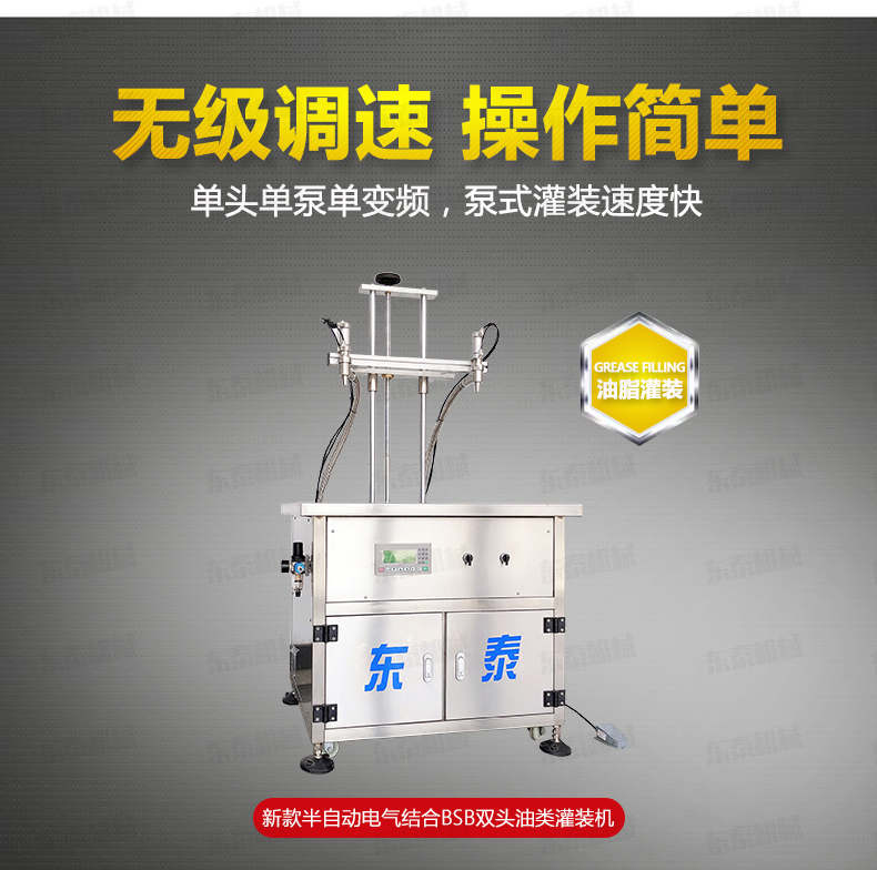 半自動(dòng)食用油灌裝機(jī)適用于各種食用油、潤滑油等粘液體的定量灌裝,如花生油,大豆油,菜籽油、香油,潤滑油等油類的灌裝。采用先進(jìn)的定量灌裝技術(shù),結(jié)合微電子智能控制技術(shù)單頭單變頻控制系統(tǒng),實(shí)現(xiàn)高精度、無級調(diào)速,操作簡單。各個(gè)灌裝頭可在一定范圍內(nèi)任意調(diào)節(jié)間距和灌裝量,可使用各種大小形狀的容器的灌裝。自動(dòng)化程度高。另外,機(jī)身零件采用優(yōu)質(zhì)不銹鋼制造,即耐用又衛(wèi)生,長時(shí)間工作性能可靠穩(wěn)定。達(dá)到GMP衛(wèi)生要求。本公司產(chǎn)品通過了IS9000質(zhì)量體系認(rèn)證。本設(shè)備經(jīng)久耐用,性能穩(wěn)定,是食用油、潤滑油等行業(yè)理想的灌裝設(shè)備。