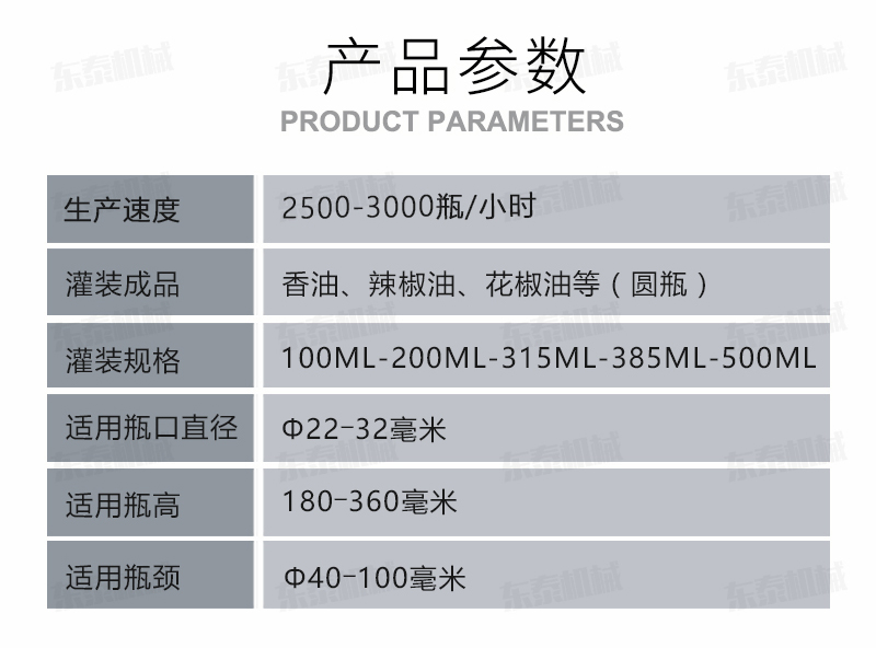 灌裝機(jī)簡述 該系列灌裝機(jī)采用容積式計量灌裝原理,適用于各種規(guī)(100ml-1000ml)的南瓜籽油、榛子油、牡丹籽油、芝麻油、核桃油、山茶油、亞麻籽油、棉籽油、橄欖油、大豆油、玉米油