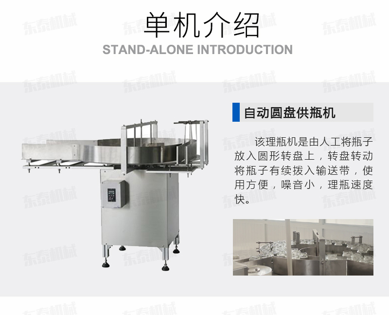 該理瓶機(jī)是由人工將瓶子放入圓形轉(zhuǎn)盤上,轉(zhuǎn)盤轉(zhuǎn)動(dòng)將瓶子有續(xù)撥入輸送帶,進(jìn)入灌裝機(jī)進(jìn)行灌裝。使用方便,噪音小,理瓶速度快,操作簡(jiǎn)單是不可缺少的一個(gè)環(huán)節(jié)。