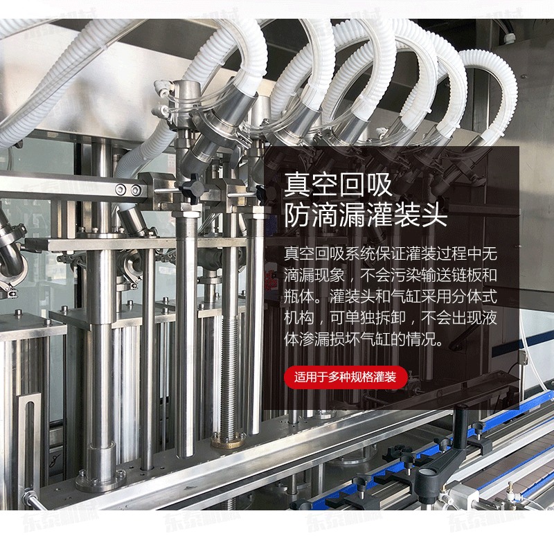 1.真空回吸系統(tǒng)保證灌裝過程中無滴漏現(xiàn)象,不會污染輸送鏈板和瓶體。灌裝頭和氣缸采用分體式機(jī)構(gòu),可單獨(dú)拆卸,不會出現(xiàn)液體滲漏損壞氣缸的情況。進(jìn)口亞德客氣缸經(jīng)久耐用,其他密封等配件使用標(biāo)準(zhǔn)件,更換維護(hù)簡單方便。